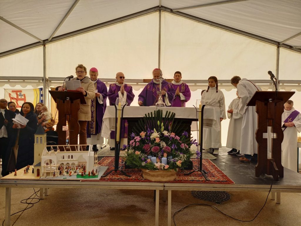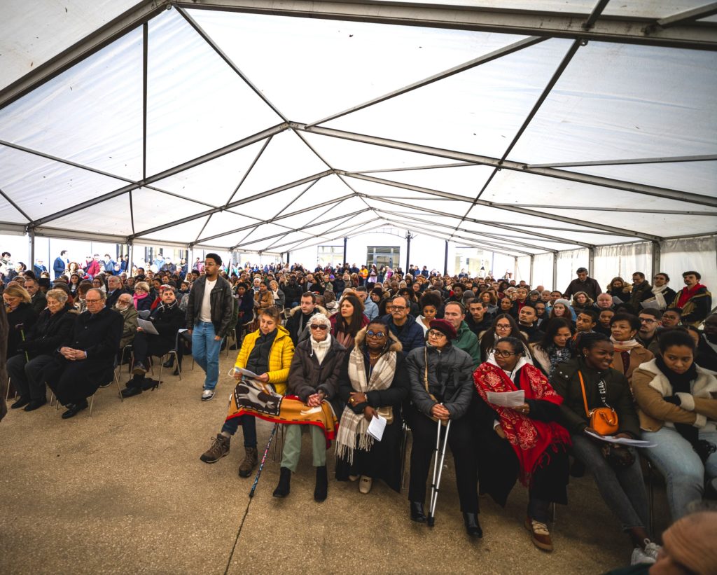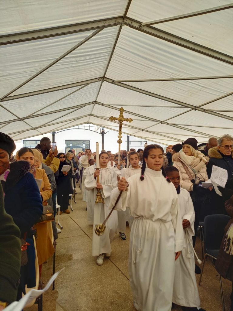 A la suite des discours de circonstance l’événement s’est poursuivi avec la célébration d’une messe à 11 heures dans l’enceinte de l’institution. Un immense barnum était dressé, qui peinait à contenir les nombreux fidèles. La messe était présidée par les deux évêques, entourés de prêtres, devant une assemblée composée de paroissiens, donateurs, officiels, partenaires et architectes. La joie se lisait sur les visages de la communauté arc-en-ciel de l’agglomération, où se côtoient une soixantaine de nationalités et où près de 30 % de la population est âgée de moins de 25 ans. La chorale et la procession des offrandes aussi reflétaient cette richesse.