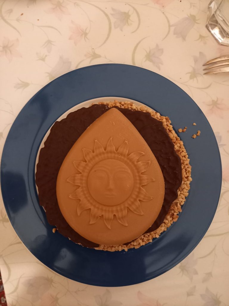 Une spécialité apportée de Luxeuil par Jacques et Aline clôturait l’excellent dîner offert par nos hôtes : le gâteau de saint Colomban, inspiré de ce qu’aurait pu trouver le saint sur son chemin : myrtilles, fraises des bois, noisettes, noix… Gâteau couvert d’une couche de chocolat ornée du soleil rayonnant de Colomban.