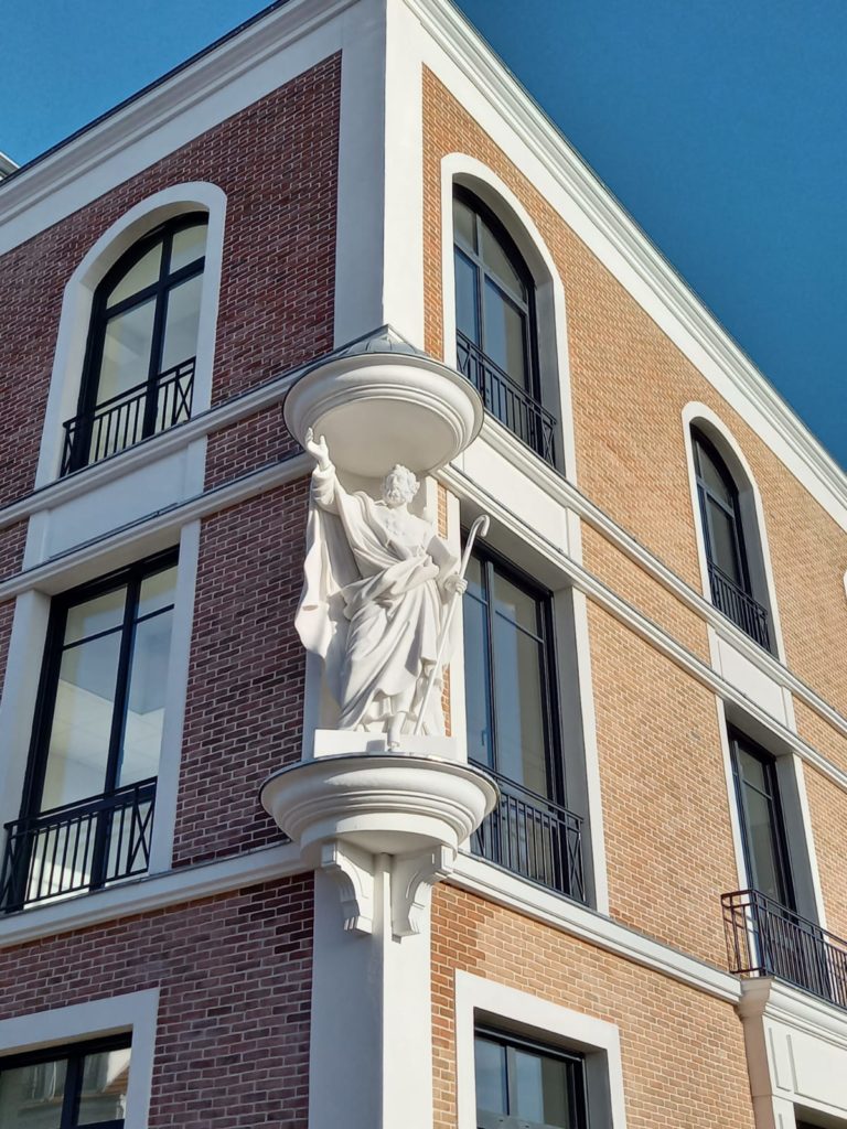 Après le verre de l’amitié servi en plein air, l’assemblée était conviée au « déjeuner partagé » dans le réfectoire, bien au chaud. En toute convivialité étaient proposés des plats chauds ou froids, mais également des spécialités asiatiques, africaines et antillaises. Puis l’après-midi nous avons emboîté le pas de Bernard pour une visite du collège, guidés par Louis-Virsna Lip, diacre séminariste du Pôle missionnaire. Cette visite s’est achevée à l’angle de l’institution scolaire, boulevard de l’Europe, où est placée depuis peu une statue de saint Colomban, taillée dans un marbre de Carrare d’un blanc étincelant.